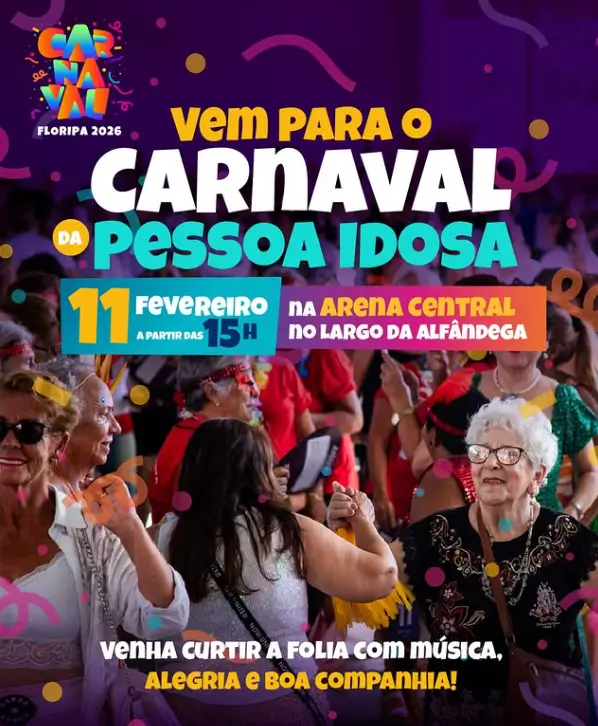 O Carnaval da Pessoa Idosa acontece no dia 11 de fevereiro, a partir das 15h, na Arena Central, no Largo da Alfândega.