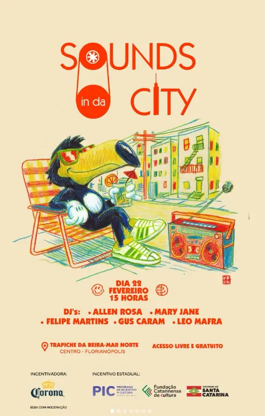 No próximo domingo, dia 22 de fevereiro, tem Sounds in da City na rua 🔥 Estaremos no Trapiche da avenida Beira-Mar Norte, no centro de Florianópolis.