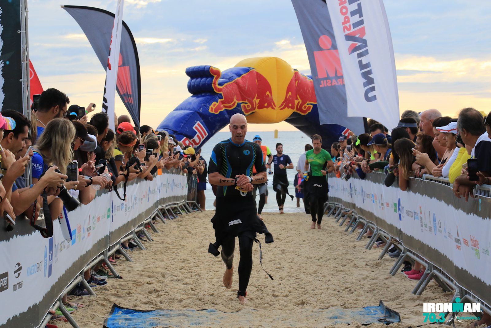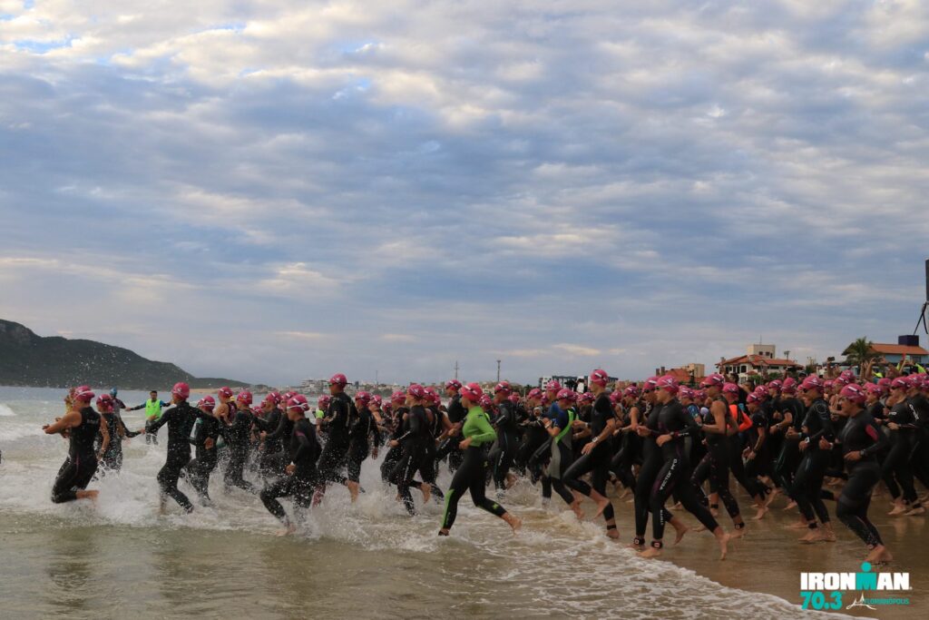 Natação: A primeira etapa é dada a largada com todos os competidores posicionados lado a lado em uma linha horizontal. Dessa forma, a marcação é feita por boias no mar, que servem como guias para os atletas.